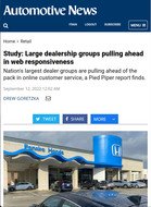 The nation's largest dealer groups are pulling ahead of the pack in online customer service, a report out Monday from retail service tracker Pied Piper found. Pied Piper used 20 best-practice behaviors to measure the internet lead effectiveness of 15 of the nation's largest dealership groups. These include speed and quality categories, making up 25 percent and 75 percent of a group's score, respectively. The firm evaluated every dealership in ...